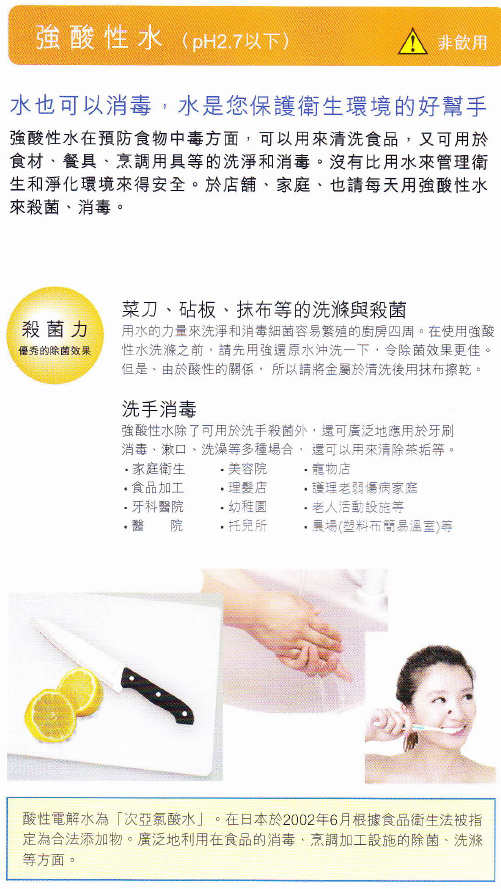 - 强酸性水由食盐水经电解产生,杀菌消毒作用后生成水和极微量的盐、醣、二氧化碳,完全没有有害的残留物