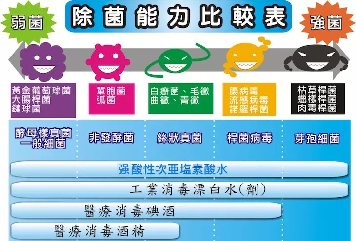 从下表也可以看出,强酸性水的杀菌消毒范围比医用碘酒和酒精等更加广泛。