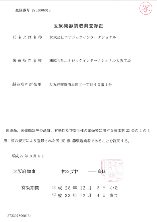 Enagic的电解水机生产的强酸性水达到了医疗用途的级别。并获得日本厚生劳动省关于杀菌的功能效果的承认。这是业内唯一在日本取得医疗设备批号并一直都作为医疗器械来生产并销售的电解水机。